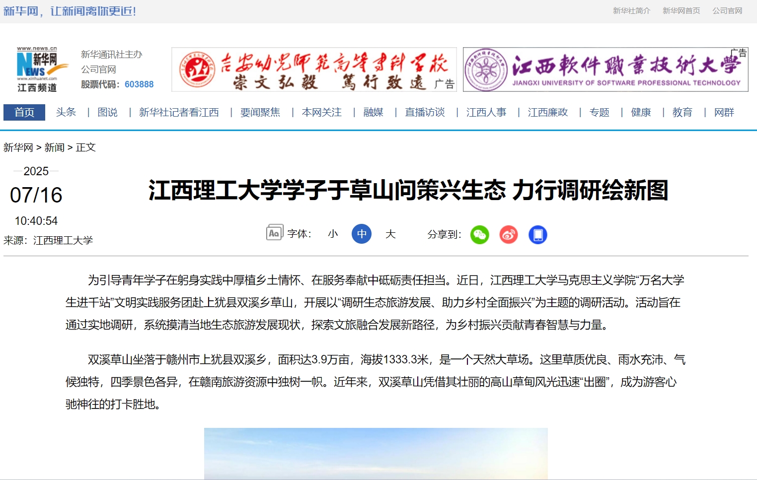 马克思主义学院“万名大学生进千站”文明实践服务团赴上犹县双溪乡草山,开展以“调研生态旅游发展、助力乡村全面振兴”为主题的调研活动。活动旨在通过实地调研,系统摸清当地生态旅游发展现状,探索文旅融合发展新路径,为乡村振兴贡献青春智慧与力量。