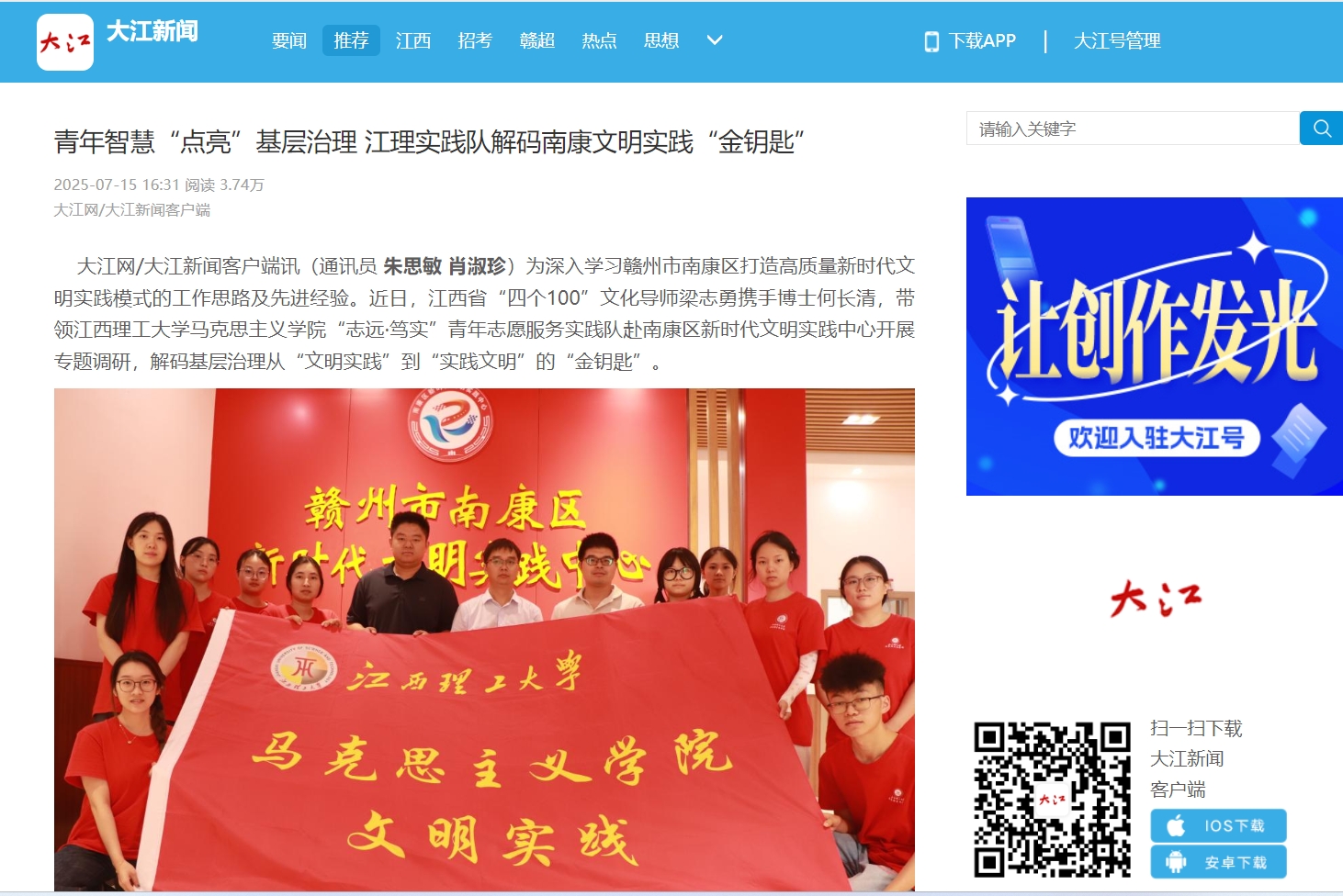 结合在唐江镇的实地调研,实践队员们深刻感受到,南康区通过高标准推进文明实践阵地提质升级,以线下出新出彩、线上有声有色的创新思路,将文明实践触角延伸至多元空间和社会治理末梢。