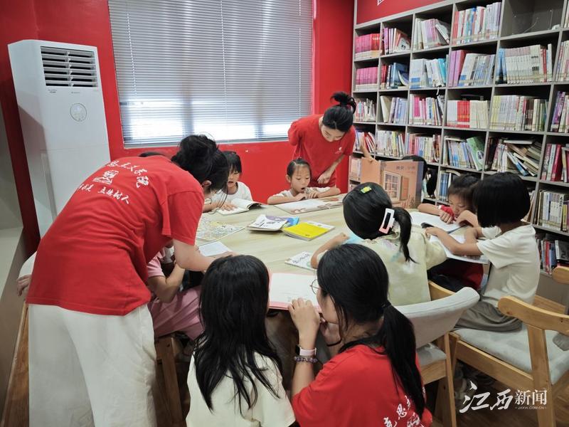 在游戏区域,童声笑语不断。“逛三园”游戏火热进行,孩子们争相报出“生态园”里的动植物名,不知不觉将上午生态课的知识融入游戏;“图书寻宝”活动中,小朋友们互相组队,并肩作战找到图书宝藏;篮球场上更是热火朝天,实践队员教孩子们投球技巧,大小身影穿梭跳跃,汗水浸湿了衣衫。