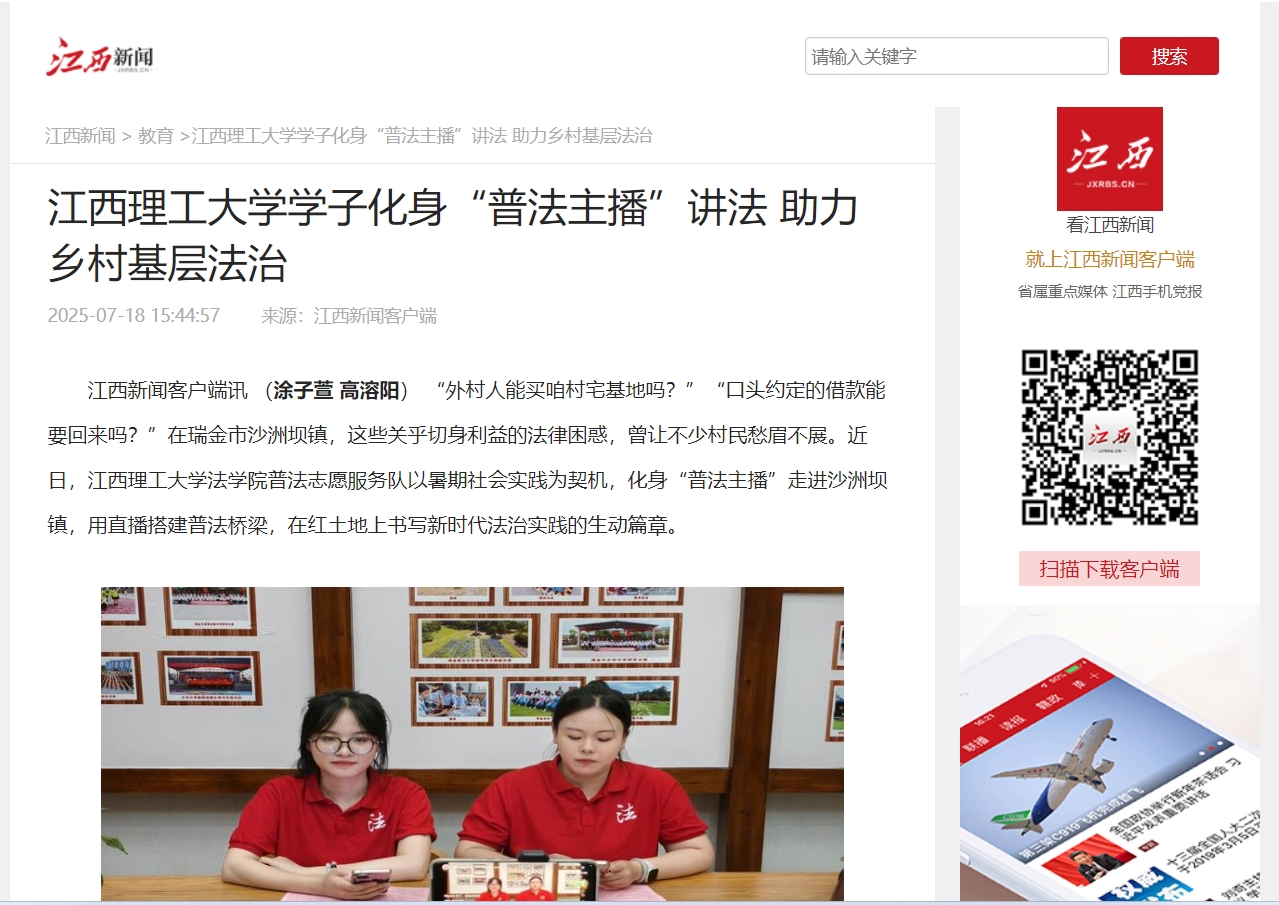 法学院普法志愿服务队以暑期社会实践为契机,化身“普法主播”走进沙洲坝镇,用直播搭建普法桥梁,在红土地上书写新时代法治实践的生动篇章。