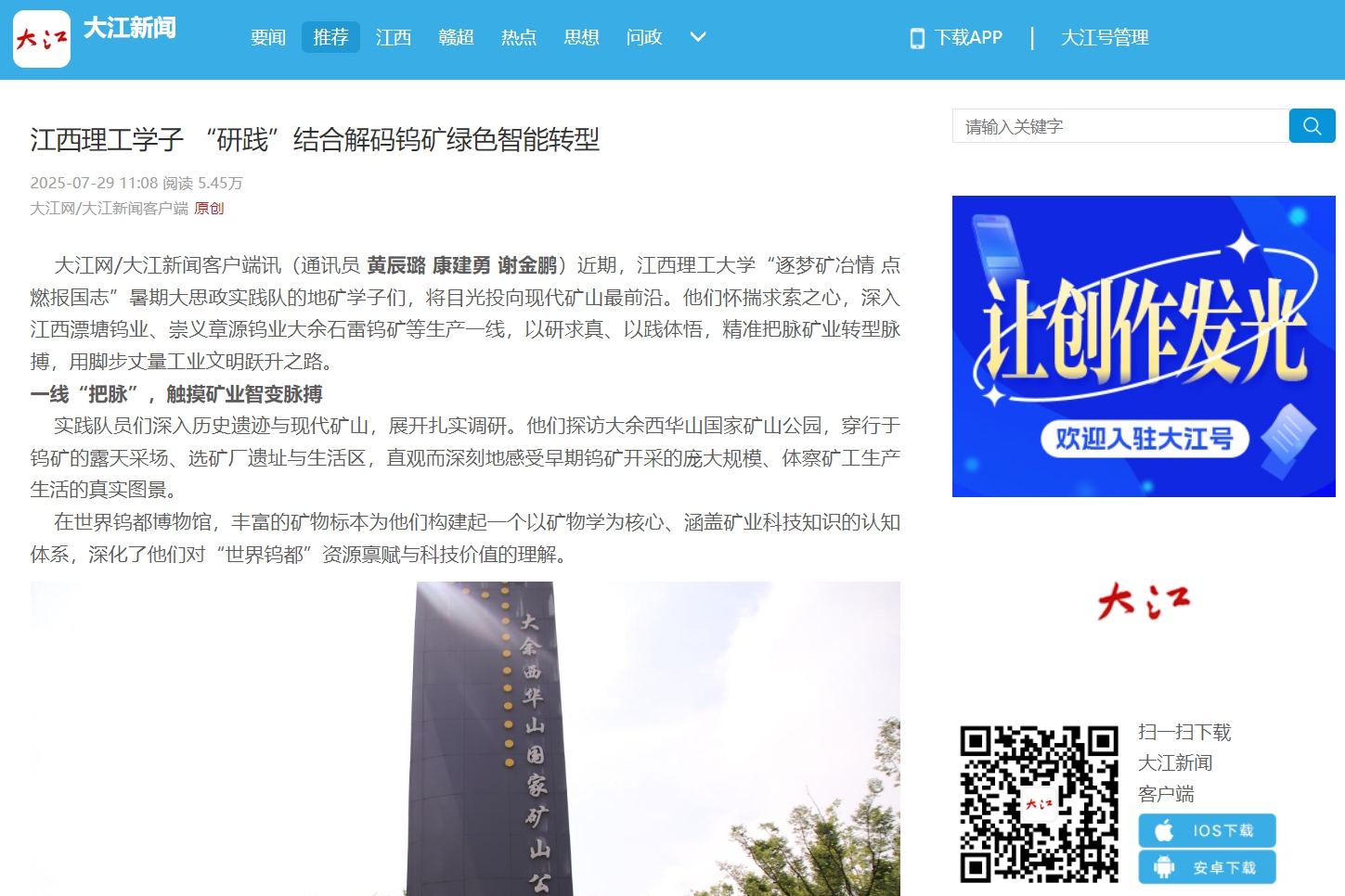 穿梭于历史与现实之间,江西理工学子通过翔实的一线数据和深切的亲身体验,构筑起研究矿业可持续发展的宝贵资源库。他们正将“研践”结合的丰硕成果转化为发展良策,以实际行动响应“强国建设有我”的时代强音,为中国式现代化江西篇章贡献青春的智慧与力量。