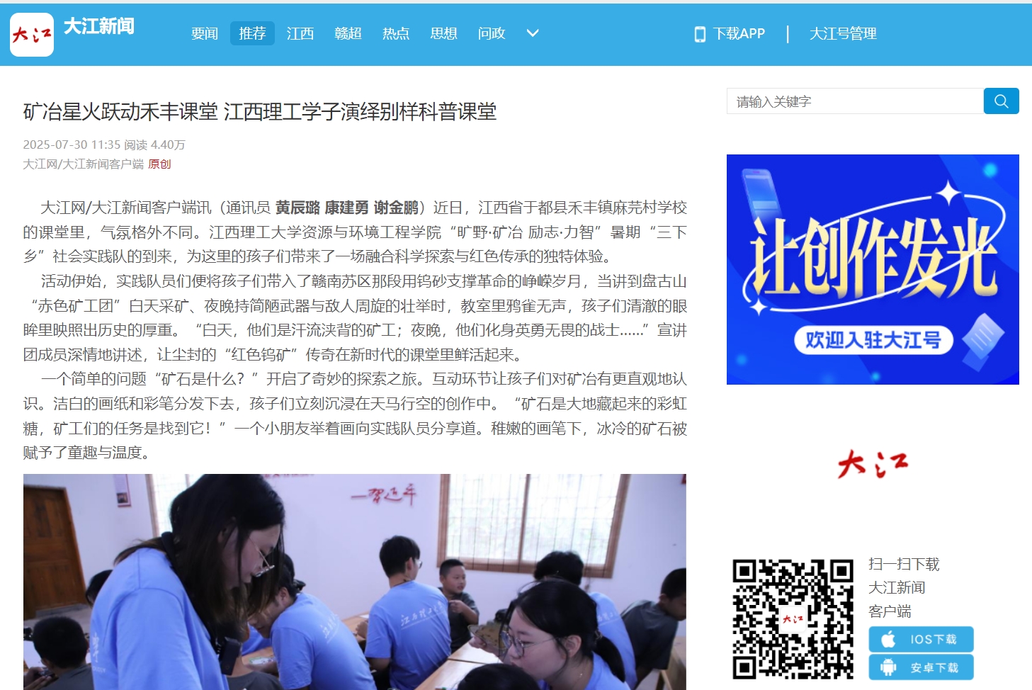 资源与环境工程学院的学子们在麻芫村的这场实践,用稀盐酸与石灰石碰撞的奇妙“化学反应”,点燃了孩子们探索矿冶科学的好奇之火;更用赣南苏区矿工们用生命守护钨砂的“精神反应”,唤醒了深植于这片土地的红色记忆与家国情怀。当“科技强国”的梦想与“红色基因”的传承在下一代心中悄然交汇,矿冶的星火,已点亮了禾丰小镇孩子们望向未来的眼睛。