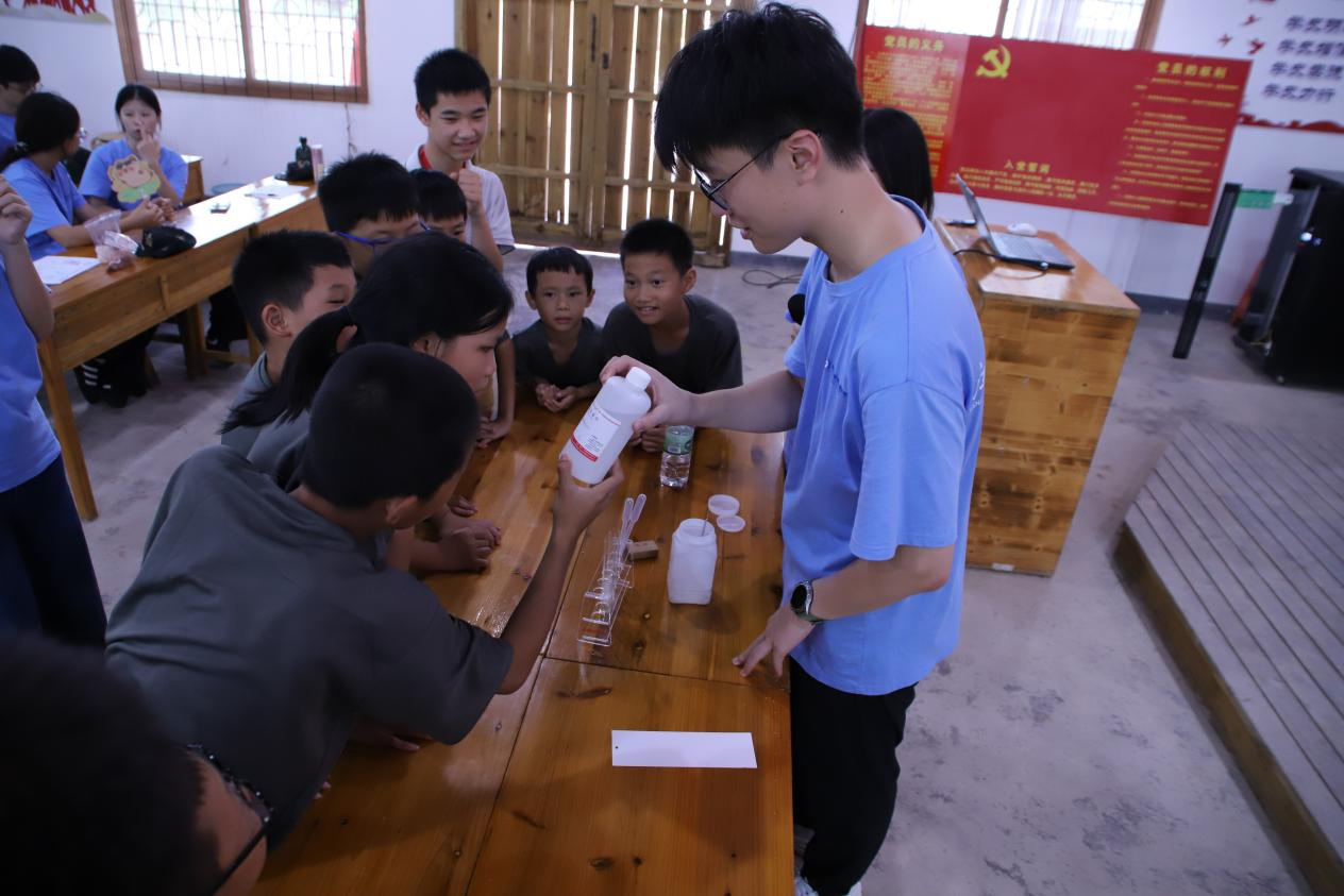 ▲实践队员指导孩子们进行矿石酸浸实验 摄影|谢金鹏
