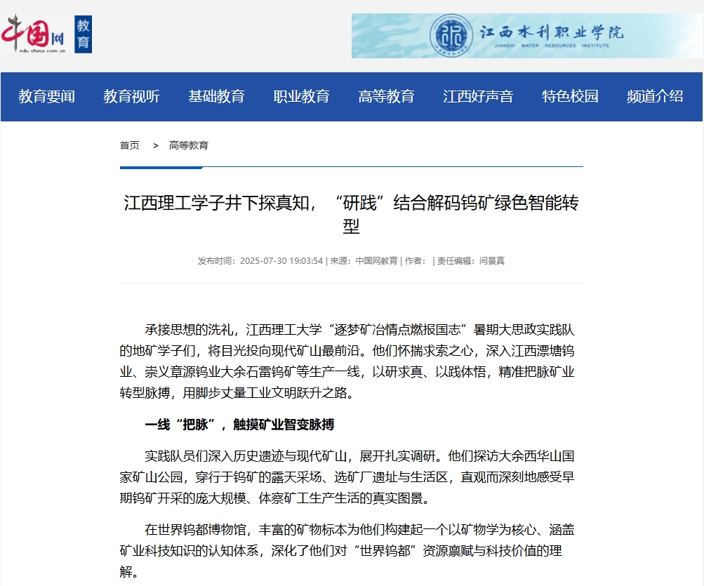 穿梭于历史与现实之间,江西理工学子通过详实的一线数据和深切的亲身体验,构筑起研究矿业可持续发展的宝贵资源库。他们正将“研践”结合的丰硕成果转化为发展良策,以实际行动响应“强国建设有我”的时代强音,为中国式现代化江西篇章贡献青春的智慧与力量。(颜射