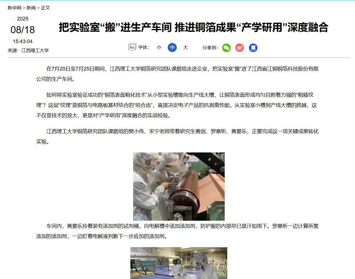 铜箔研究团队课题组走进企业,把实验室“搬”进了江西省江铜铜箔科技股份有限公司的生产车间。