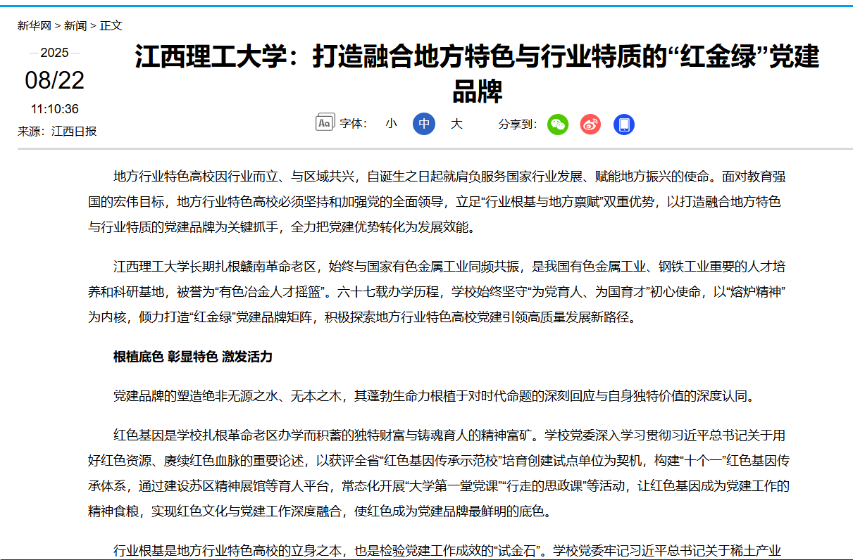 行业根基是地方行业特色高校的立身之本,也是检验党建工作成效的“试金石”。学校党委牢记习近平总书记关于稀土产业发展的重要指示精神,提出建设“稀土及关键矿产领域世界一流大学”目标,将学校事业发展深度融入行业和区域发展大局。构建“一院一县(行业、领域)多企业”联系制度,实施“1+1+1”基层党组织“手拉手”行动,与地方、企业开展党建联建,以党建链贯通人才链、科技链、产业链,在服务国家战略和区域经济发展的前沿淬炼党建品牌的责任担当与实干成色。