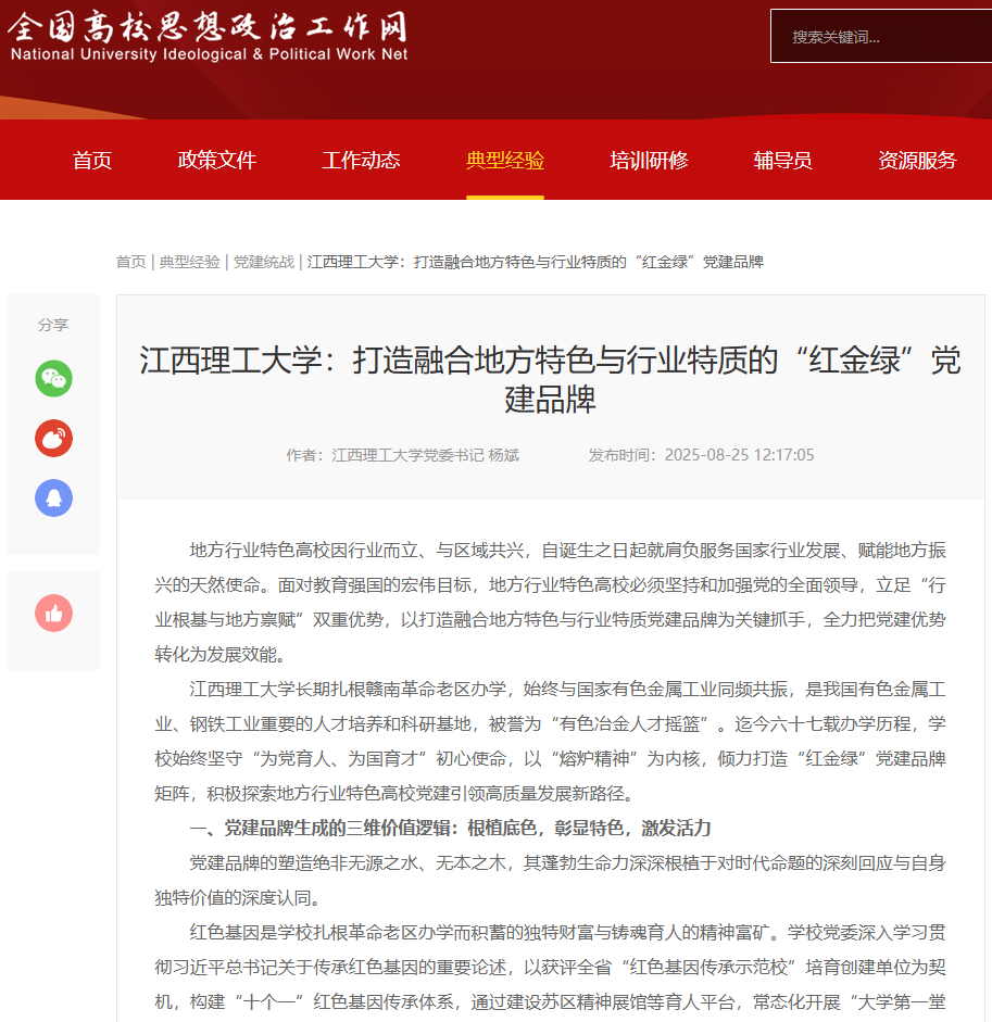 长期扎根赣南革命老区办学,始终与国家有色金属工业同频共振,是我国有色金属工业、钢铁工业重要的人才培养和科研基地,被誉为“有色冶金人才摇篮”。迄今六十七载办学历程,学校始终坚守“为党育人、为国育才”初心使命,以“熔炉精神”为内核,倾力打造“红金绿”党建品牌矩阵,积极探索地方行业特色高校党建引领高质量发展新路径。