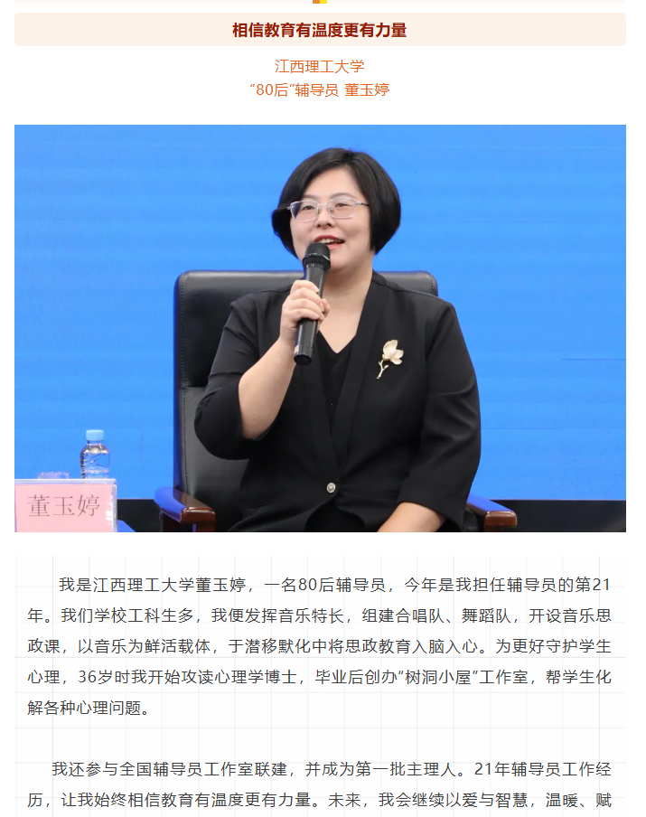 董玉婷,一名80后辅导员,今年是我担任辅导员的第21年。我们学校工科生多,我便发挥音乐特长,组建合唱队、舞蹈队,开设音乐思政课,以音乐为鲜活载体,于潜移默化中将思政教育入脑入心。为更好守护学生心理,36岁时我开始攻读心理学博士,毕业后创办“树洞小屋”工作室,帮学生化解各种心理问题。