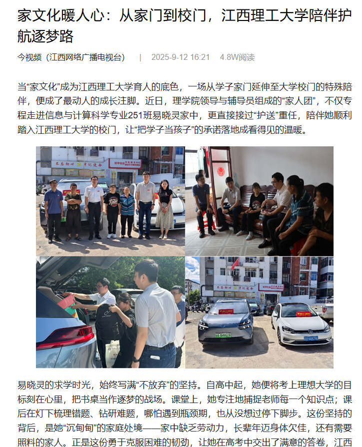 开启了大学生活。“老师从家里把我接到学校,这份温暖我记在心里,我一定会更加努力。”既以学识改善家庭困境、撑起“小家”,更立报国之志,以过硬本领服务“大家”,这既是理学院院长徐中辉对易晓灵的暖心寄语,也是她的青春宣言。这场从家门到校门的陪伴,不仅是一次简单的报到护航,更是颜射