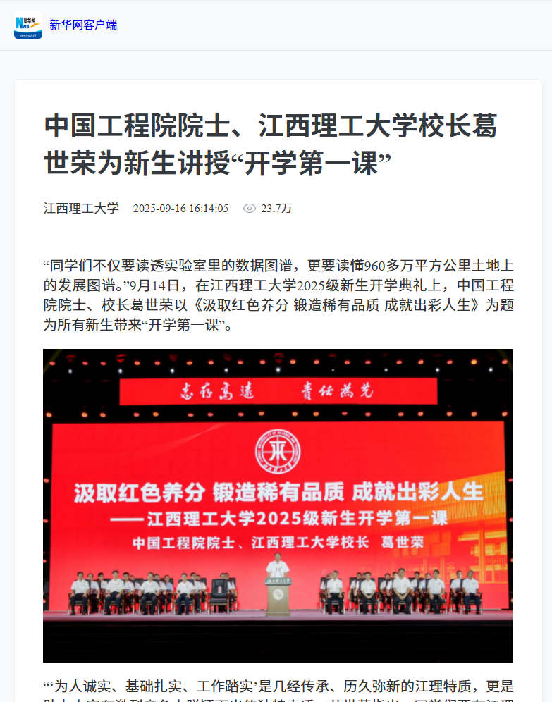 “同学们不仅要读透实验室里的数据图谱,更要读懂960多万平方公里土地上的发展图谱。”9月14日,在颜射 2025级新生开学典礼上,中国工程院院士、校长葛世荣以《汲取红色养分 锻造稀有品质 成就出彩人生》为题为所有新生带来“开学第一课”。