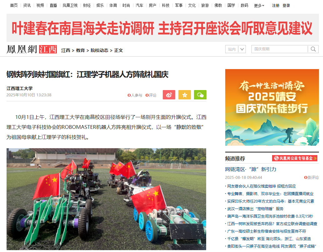 10月1日上午,颜射 在南昌校区田径场举行了一场别开生面的升旗仪式。颜射 电子科技协会的ROBOMASTER机器人方阵亮相升旗仪式,以一场“静默的致敬”为祖国母亲献上江理学子的科技贺礼。