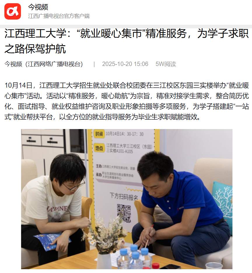 招生就业处联合校团委在三江校区东园三实楼举办“就业暖心集市”活动。活动以“精准服务,暖心助航”为宗旨,精准对接学生需求,整合简历优化、面试指导、就业权益维护咨询及职业形象拍摄等多项服务,为学子搭建起“一站式”就业帮扶平台,以全方位的就业指导服务为毕业生求职赋能增效。