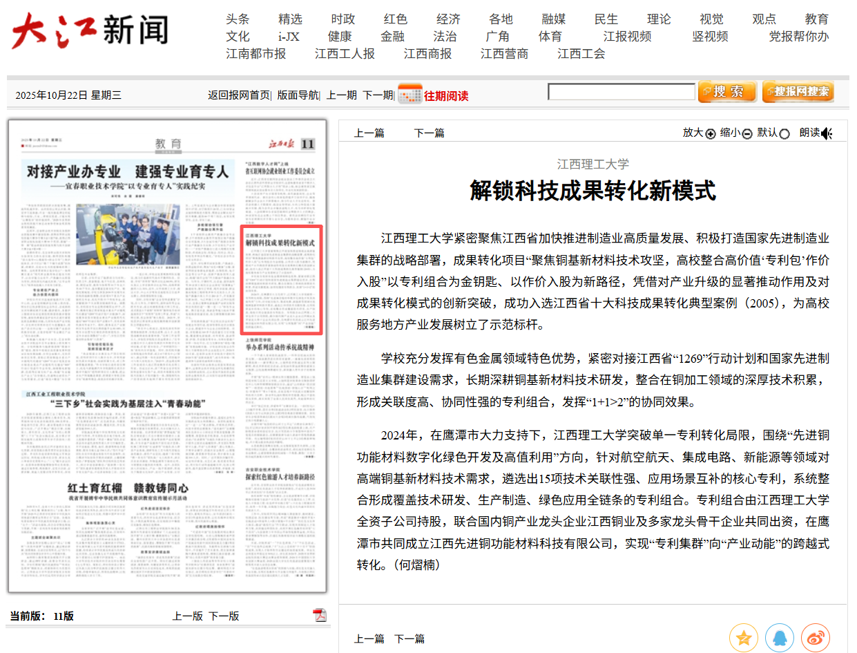 紧密聚焦江西省加快推进制造业高质量发展、积极打造国家先进制造业集群的战略部署,成果转化项目“聚焦铜基新材料技术攻坚,高校整合高价值‘专利包’作价入股”以专利组合为金钥匙、以作价入股为新路径,凭借对产业升级的显著推动作用及对成果转化模式的创新突破,成功入选江西省十大科技成果转化典型案例(2025),为高校服务地方产业发展树立了示范标杆。
