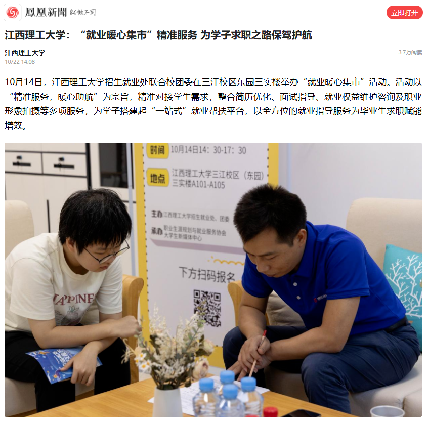 招生就业处联合校团委在三江校区东园三实楼举办“就业暖心集市”活动。活动以“精准服务,暖心助航”为宗旨,精准对接学生需求,整合简历优化、面试指导、就业权益维护咨询及职业形象拍摄等多项服务,为学子搭建起“一站式”就业帮扶平台,以全方位的就业指导服务为毕业生求职赋能增效。