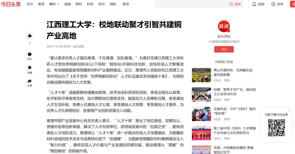 鹰潭市铜产业发展中心有关负责人表示,“人才十条”推出了岗位晋级、双聘互认、房票补贴等创新举措,解决了人才在跨单位、跨领域发展中的“后顾之忧”,能有效激发人才创新活力。鹰潭将以“人才十条”进一步推动校地人才深度融合,为铜基新材料领域的技术攻关与成果转化按下“加速键”,为国家级铜基新材料集群建设注入“智力内核”,最终实现人才价值与产业发展的同频共振,推动鹰潭从“铜都”向“铜创高地”的跨越升级。