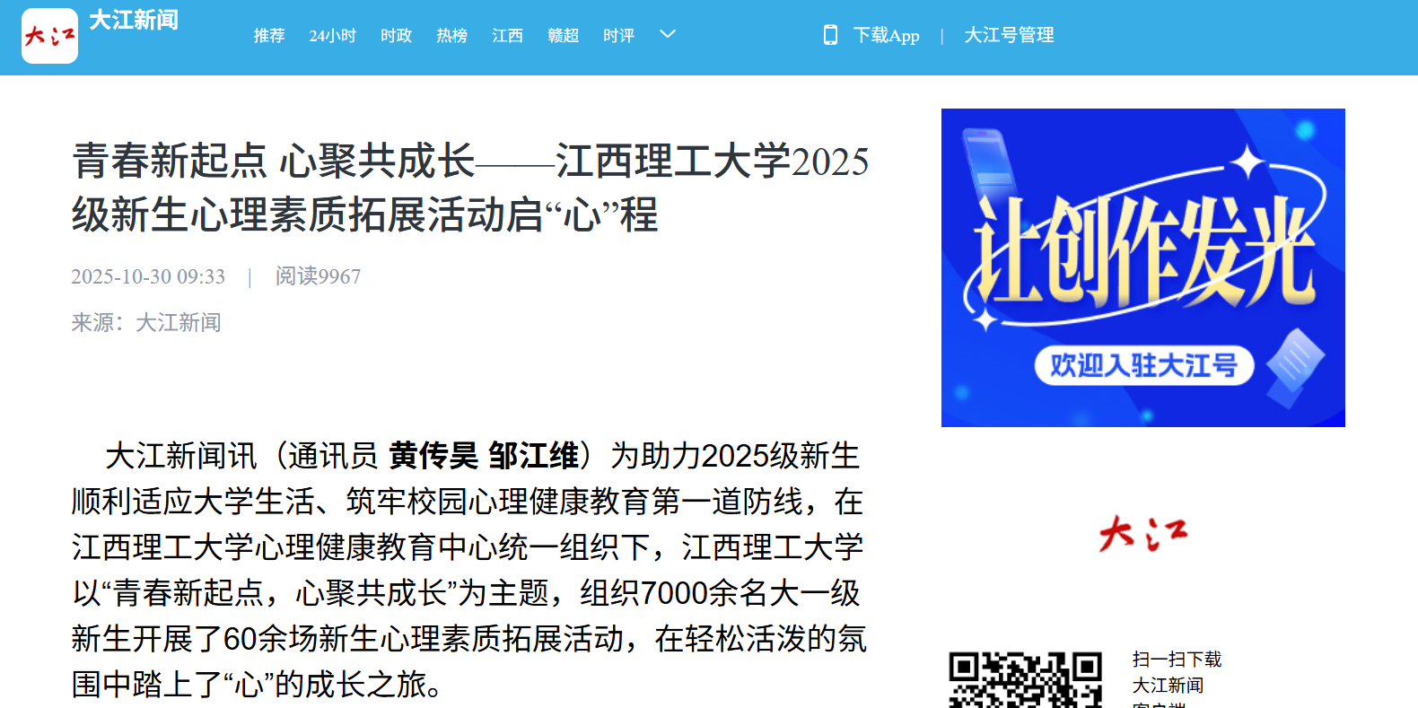 大江新闻讯(通讯员黄传昊 邹江维)为助力2025级新生顺利适应大学生活、筑牢校园心理健康教育第一道防线,在颜射