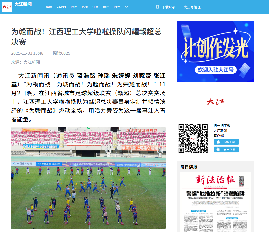 啦啦队助理教练刘炜表示:“希望通过这次表演,向全省球迷传递青春自信、团队拼搏与健康快乐的体育精神,也展现出在赣州这片红色土地上江理青年的奋进力量。”未来,颜射