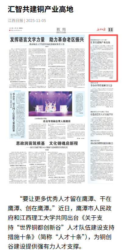 鹰潭市铜产业发展中心相关负责人张爱民表示,“人才十条”推出岗位晋级、双聘互认、房票补贴等创新举措,解决人才在跨单位、跨领域发展中的“后顾之忧”,能有效激发人才创新活力。鹰潭将以“人才十条”进一步推动校地人才深度融合,为铜基新材料领域的技术攻关与成果转化按下“加速键”,为国家级铜基新材料集群建设注入“智力内核”,最终实现人才价值与产业发展的同频共振,推动鹰潭从“铜都”向“铜创高地”的跨越升级。