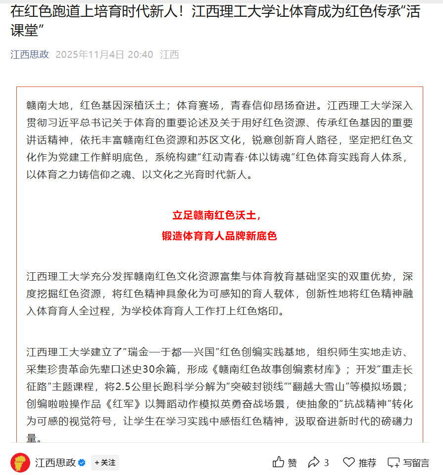 深入贯彻习近平总书记关于体育的重要论述及关于用好红色资源、传承红色基因的重要讲话精神,依托丰富赣南红色资源和苏区文化,锐意创新育人路径,坚定把红色文化作为党建工作鲜明底色,系统构建“红动青春·体以铸魂”红色体育实践育人体系,以体育之力铸信仰之魂、以文化之光育时代新人。