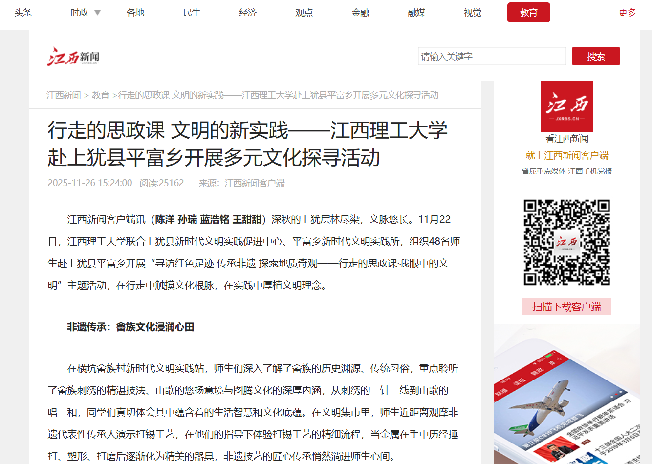 联合上犹县新时代文明实践促进中心、平富乡新时代文明实践所,组织48名师生赴上犹县平富乡开展“寻访红色足迹 传承非遗 探索地质奇观——行走的思政课·我眼中的文明”主题活动,在行走中触摸文化根脉,在实践中厚植文明理念。