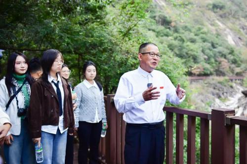 “冰川融水沿着裂隙向下流动,这些水流速度很快且力度十分均匀,同时携带了大量碎石、砂粒等‘磨料’不停地冲击两岸,形成了多种多样的圆坑,仿佛用圆规画出来的圆柱,这就是‘河谷冰臼’。”暖阳下,矿业工程学院副院长陈飞带领师生穿行在燕子岩景区,在丹霞奇峰、飞瀑林海构成的自然画卷中上了一堂“行走的思政课”,同学们在游览中解开了地球演化的密码,读懂了地球的“年轮”。景区讲解员同步普及生态保护理念,师生们在灵泽潭、同心桥等地定格“红色文化+绿色生态”的交融瞬间,让革命精神与生态文明理念同频共振。