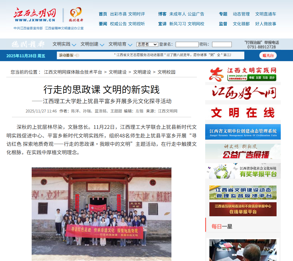 联合上犹县新时代文明实践促进中心、平富乡新时代文明实践所,组织48名师生赴上犹县平富乡开展“寻访红色 探索地质奇观——行走的思政课·我眼中的文明”主题活动,在行走中触摸文化根脉,在实践中厚植文明理念。