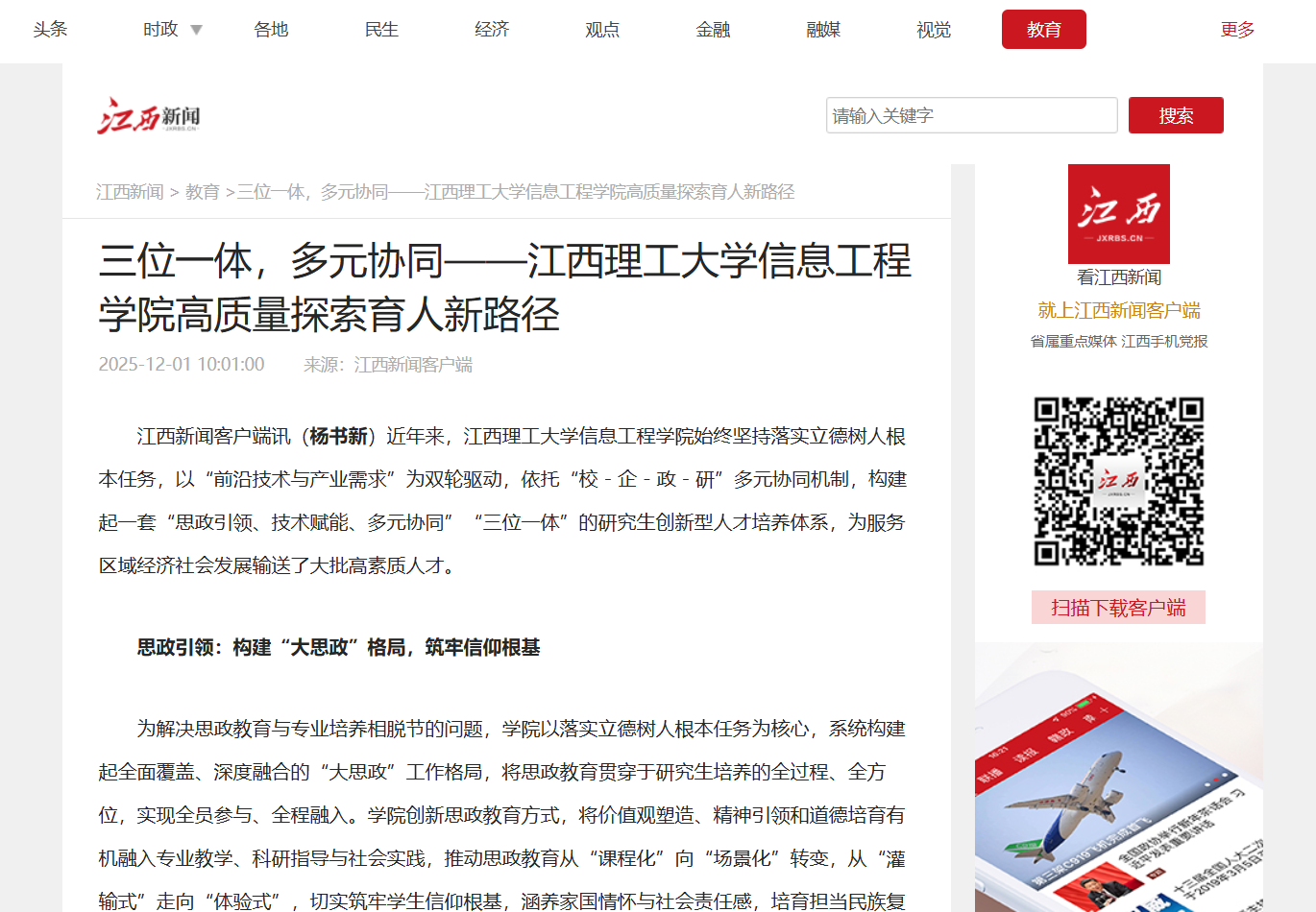 信息工程学院始终坚持落实立德树人根本任务,以“前沿技术与产业需求”为双轮驱动,依托“校 - 企 - 政 - 研”多元协同机制,构建起一套“思政引领、技术赋能、多元协同”“三位一体”的研究生创新型人才培养体系,为服务区域经济社会发展输送了大批高素质人才。