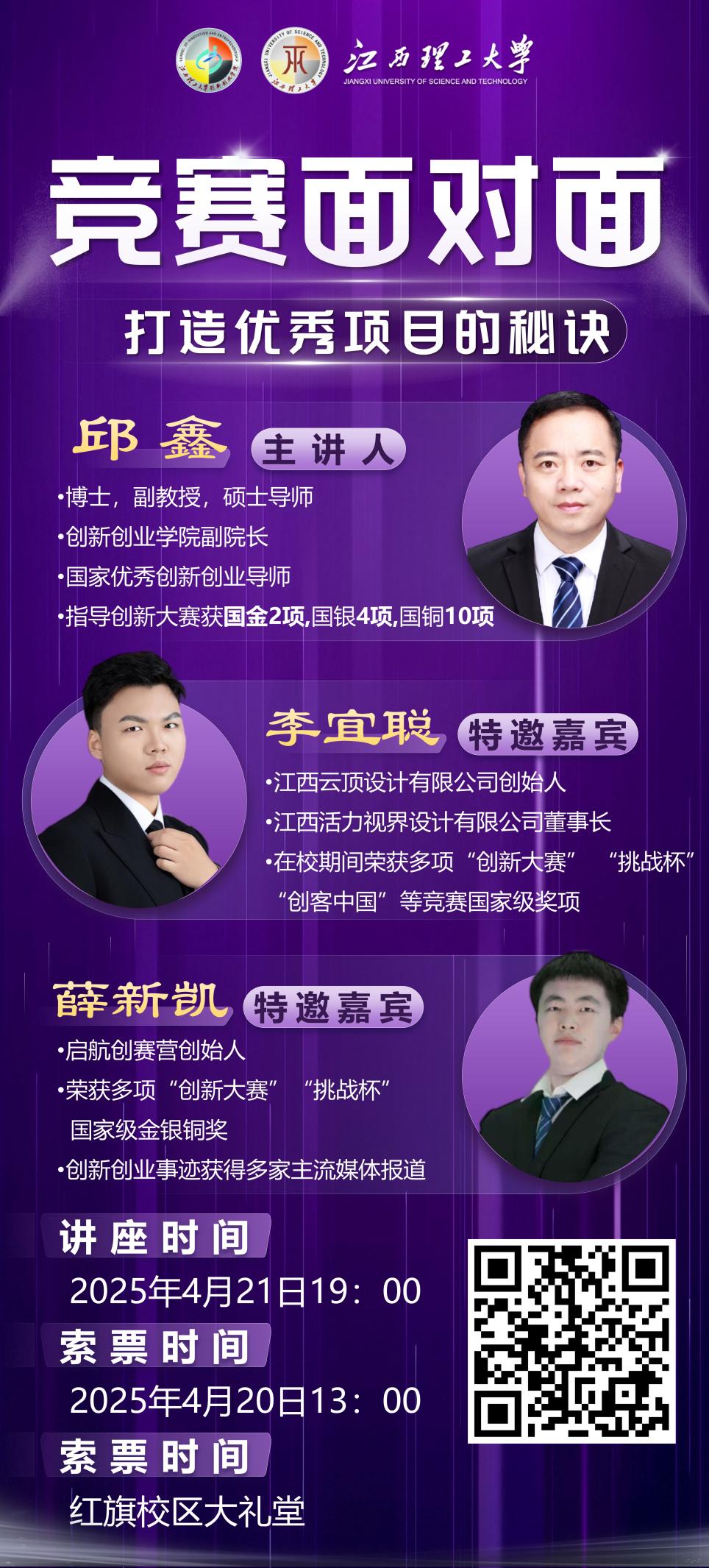 为提高颜射 学生双创意识和竞赛能力,为创新大赛参赛团队“指点迷津”,创新创业学院将于2025年4月21日19:00在红旗校区大礼堂举办题为《竞赛面对面:打造优秀项目的秘诀》的讲座。