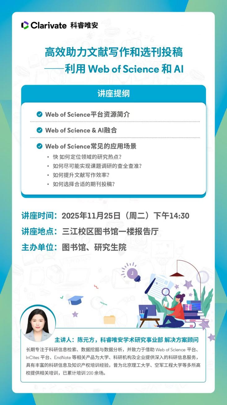 讲座主题:高效开展文献写作与选刊投稿——利用Web of Science客观数据和AI