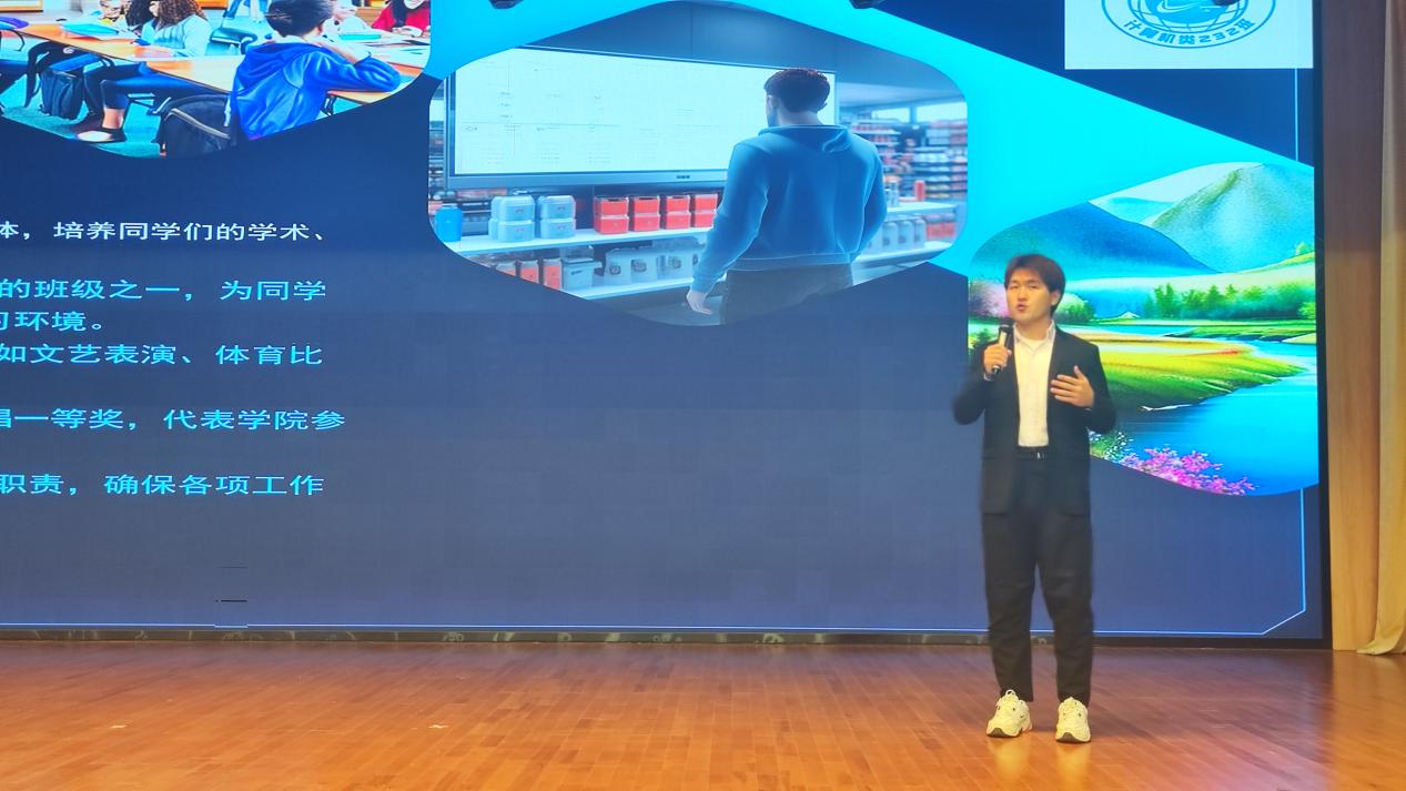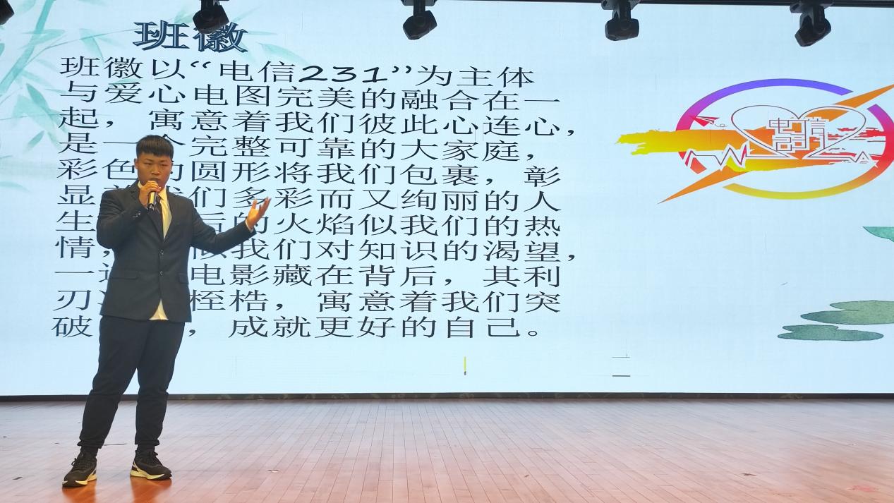 赛时,各班代表精神饱满,信心十足,锐意进取,不仅紧扣“一班一品一特色”的主题,更以精心制作的演示文稿、言简意赅的文字展示和激情澎湃的演讲,分别从班训、班徽设计理念、如何营造浓厚学风、重点培养双创能力、关注个性化发展等班级规划方面展现了各班独有的班级风采。其中,电信231班“路虽远,行则将至;事虽难,做则必成”的班训展现出当代青年应该冲锋在前,勇挑重担、勇克难关、勇斗风险,号召着在座青年学生用拼搏和奋斗书写新时代青春答卷。电信235的班徽设计则引人注目,整体为暖阳色、以云雾、滑翔、祥云、蛟龙等多种元素构成,象征着从“神舟”飞天到“蛟龙”入海,从“天眼”寻空,到“天问”探火,从我国超级计算机实现千万亿到百亿亿次的飞跃等等,每个惊艳世人的“国之重器”都凝聚着勇闯“无人区”的青年力量,表达了电信235班的同学们怀抱梦想又脚踏实地,展现出青年学子敢想敢为的决心,且善做善成的美好期望。比赛现场掌声不断,各班同学都不禁为班级未来发展建设充满信心。