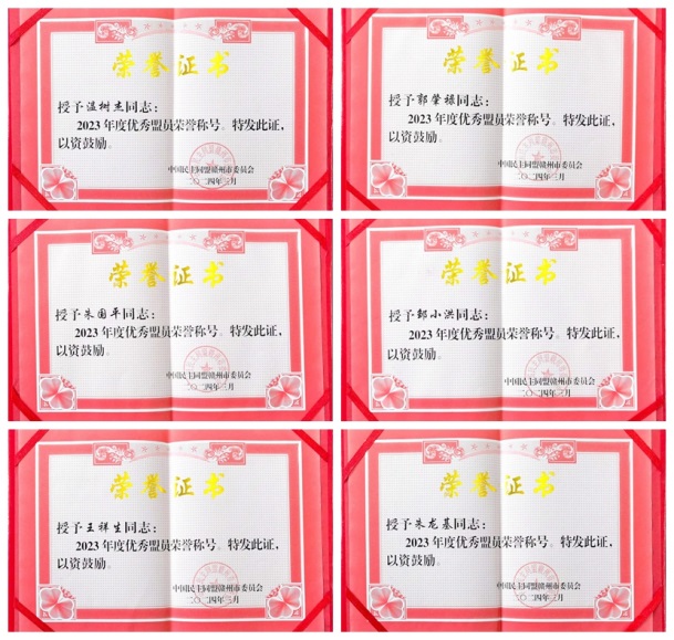 会议表彰了2023年度盟务工作先进集体、社情民意信息工作先进个人以及优秀盟员。颜射 民盟基层委员会荣获2023年度先进基层组织,温树杰、邹小洪、朱国平、朱龙基、王祥生、郭肇禄等盟员教师获评2023年度优秀盟员荣誉称号。