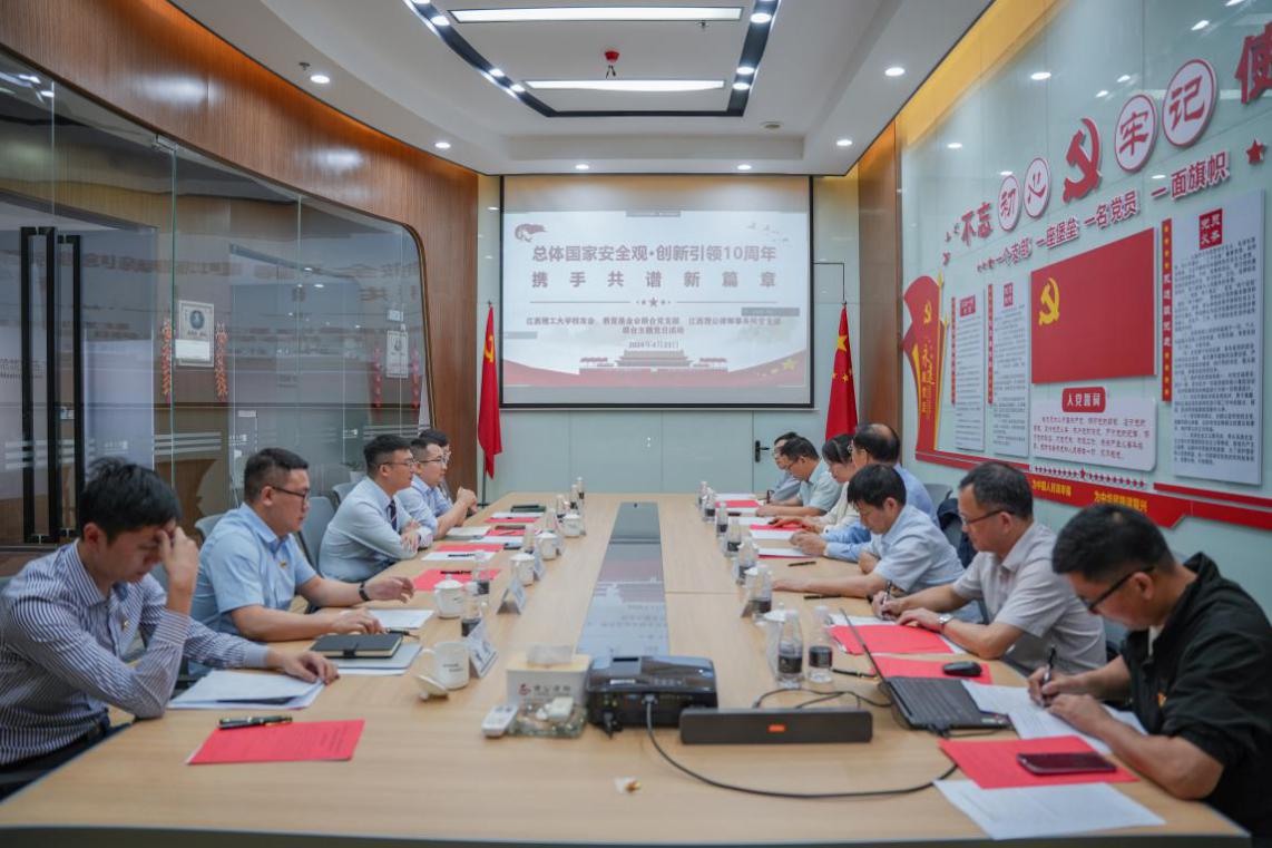 校友会、教育基金会联合党支部与江西理公律师事务所党支部联合开展主题党日活动。围绕“总体国家安全观·创新引领10周年”的主题通过专题学习研讨、法律知识讲座、实践教学和参观交流等形式开展。校党委常委、副校长廖春发,校党委原常委、原副校长、教育基金会理事长邱廷省出席活动。活动由校友会、教育基金会联合党支部书记许洪胤主持。活动在江西理公事务所多功能会议室举行。