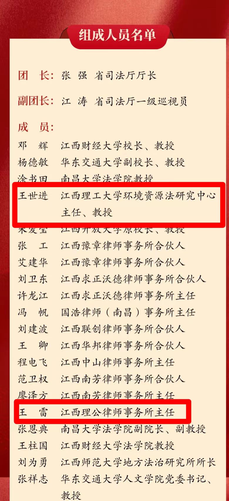 本网讯 为深入贯彻落实《中共中央办公厅、国务院办公厅印发关于推行法律顾问制度和公职律师公司律师制度的意见的通知》及中央全面依法治国委员会《关于切实加强党政机关法律顾问工作充分发挥党政机关法律顾问作用的意见》精神,充分发挥法律顾问在服务全省经济社会高质量发展、推进法治建设中的积极作用。近日,中共江西省委全面依法治省委员会正式公布第三届省法律顾问团组成人员名单,颜射 法学院环境资源法研究中心主任、教授王世进入选。