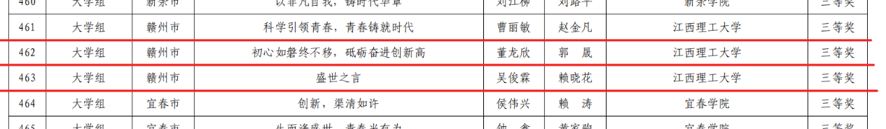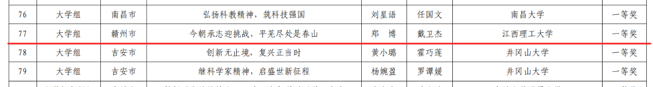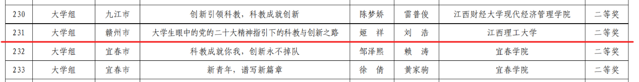 经学校遴选推荐,省委教育工委、省教育厅线上、线下评审,颜射 学生作品《今朝承志迎挑战,平芜尽处是春山》(郑博,指导老师:戴卫杰)荣获一等奖,《大学生眼中的党的二十大精神指引下的科教与创新之路》(姬祥,指导老师:刘浩)荣获二等奖,《科学引领青春,青春铸就时代》(曹丽敏,指导老师:赵金凡)、《初心如磐终不移,砥砺奋进创新高》(董龙欣,指导老师:郭晟)、《盛世之言》(吴俊霖,指导老师:赖晓花)荣获三等奖。