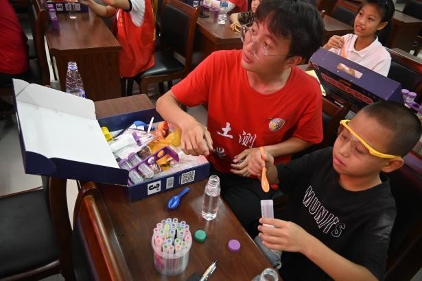 “哇,水变了,水变了!”一阵阵惊讶声从伍岭村童心港湾内传出,小朋友们专注地观察课堂小实验的每一步变化,认真体会到了原水到自来水的质变。团员们用石英砂、纱布、净化石、细沙、活性炭等“滤芯”材料制作了简易的净水器,向小朋友们介绍了原水絮凝、过滤、消毒直至自来水输送入户的整个流程。课上,实践团团员关锦强还从颜色、沉淀物、酸碱性和透明度等方面向小朋友们展示了红井水、河流水和矿泉水的不同之处;文圣平用通俗易懂的语言讲述了《一壶水的故事》《水缸的秘密》等革命年代中的小故事。