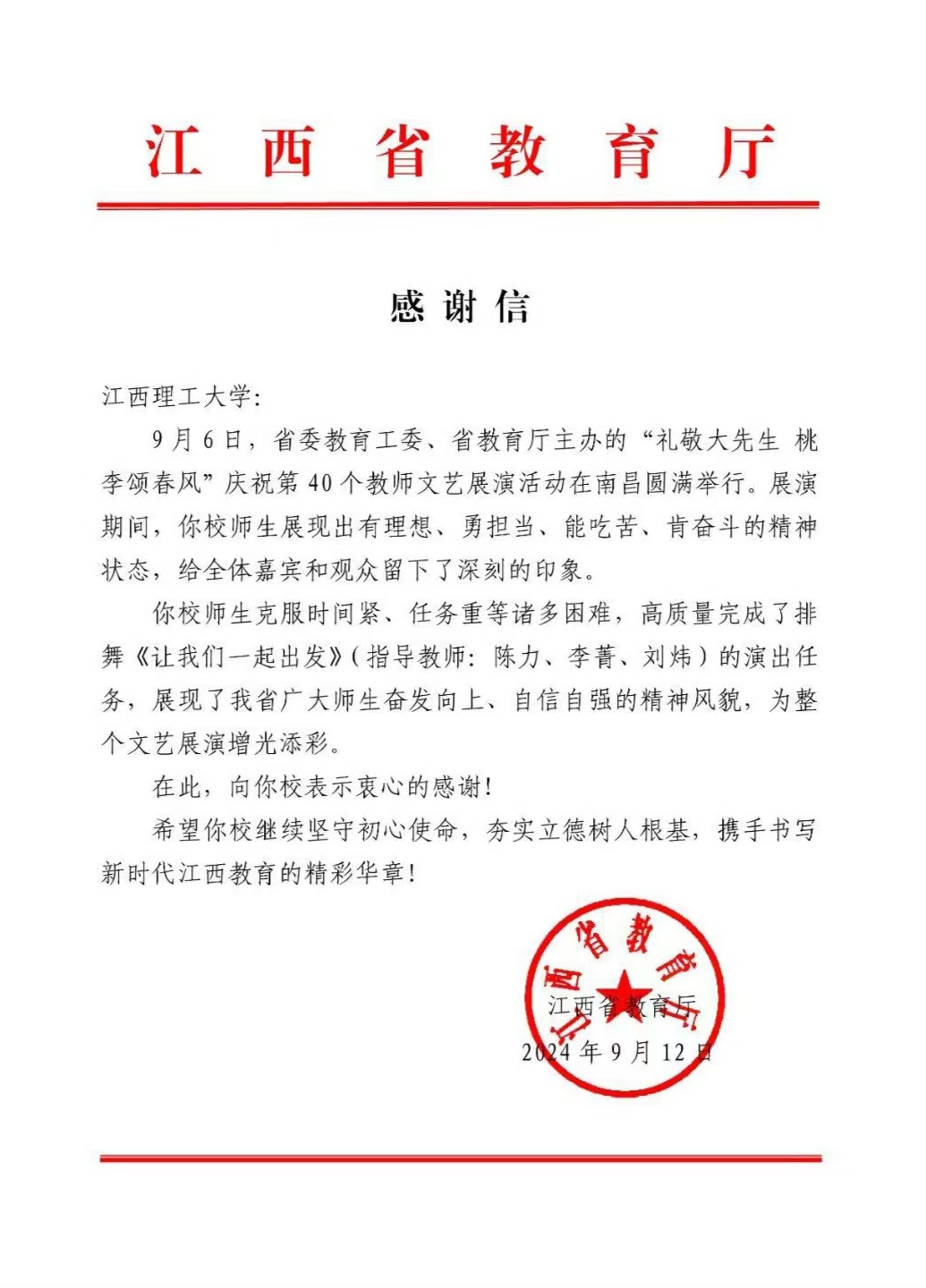 本网讯 9月12日,江西省教育厅向颜射 啦啦操队发来感谢信,信中对学校啦啦操队以“有理想、勇担当、能吃苦、肯奋斗的精神状态”克服诸多困难,高标准完成了排舞《让我们一起出发》节目给予了高度认可,对学校啦啦操队为整个文艺展演作出的卓越贡献致以最诚挚的感谢。
