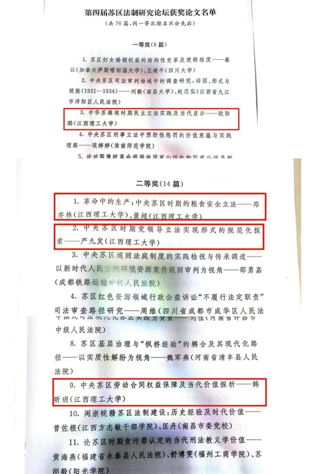 法学院党委副书记欧阳鹏撰写的论文《中华苏维埃时期民主立法实践及当代启示》获一等奖;赣南科技学院党委委员、党委宣传部部长邓亦林、颜射