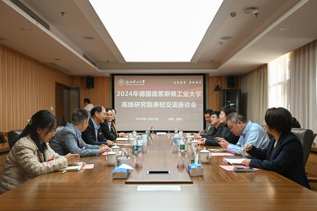 本网讯 12月2日,德国德累斯顿工业大学高级研究院TUDIAS中国事务主管、中国分院院长WEI ZHANG一行来校交流。校党委常委、副校长廖春发在濂溪楼会见外宾,教务处、国际交流与合作中心(国际教育学院、港澳台事务中心)相关负责人参加座谈。
