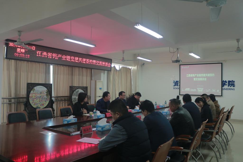 本网讯  12月3日,为探索党建引领产业链高质量发展新路径,资源与环境工程学院与赣州有色冶金研究所有限公司在黄金校区逸夫楼第一会议室举行江西省钨产业链党建共建签约暨交流座谈会。赣州有色冶金研究所有限公司总经理杨文龙、副总经理饶宇欢、公司党委组织部、鑫宇矿冶有限公司相关负责人,资源与环境工程学院党委书记陈明、院长何桂春、党委副书记张春雷、副院长陈飞、余新阳等出席会议。会议由陈明主持。