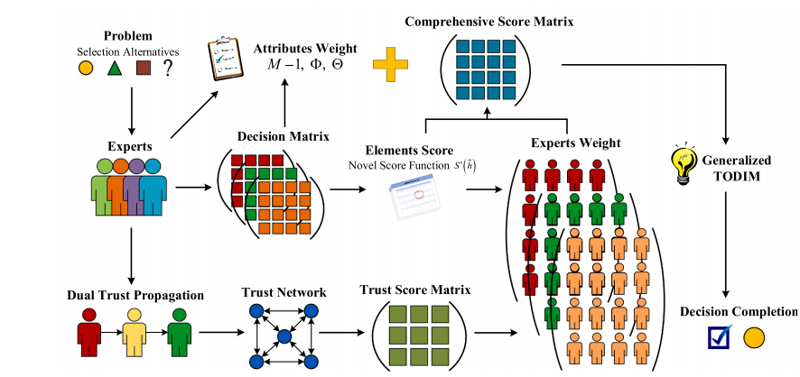 论文重点研究了区间犹豫模糊集(IVHFS)的得分函数,通过考虑区间宽度的模糊性和多个区间的犹豫不确定性,为IVHFS开发了新的偏差函数,基于新的偏差函数和传统的得分函数,开发出新的IVHFS得分函数。并利用IVHFS的新得分函数和信任网络提出了广义的TODIM评估方法。实现了决策者社会关系、职业背景以及心理行为等因素在模糊和复杂的群体决策场景中的应用。