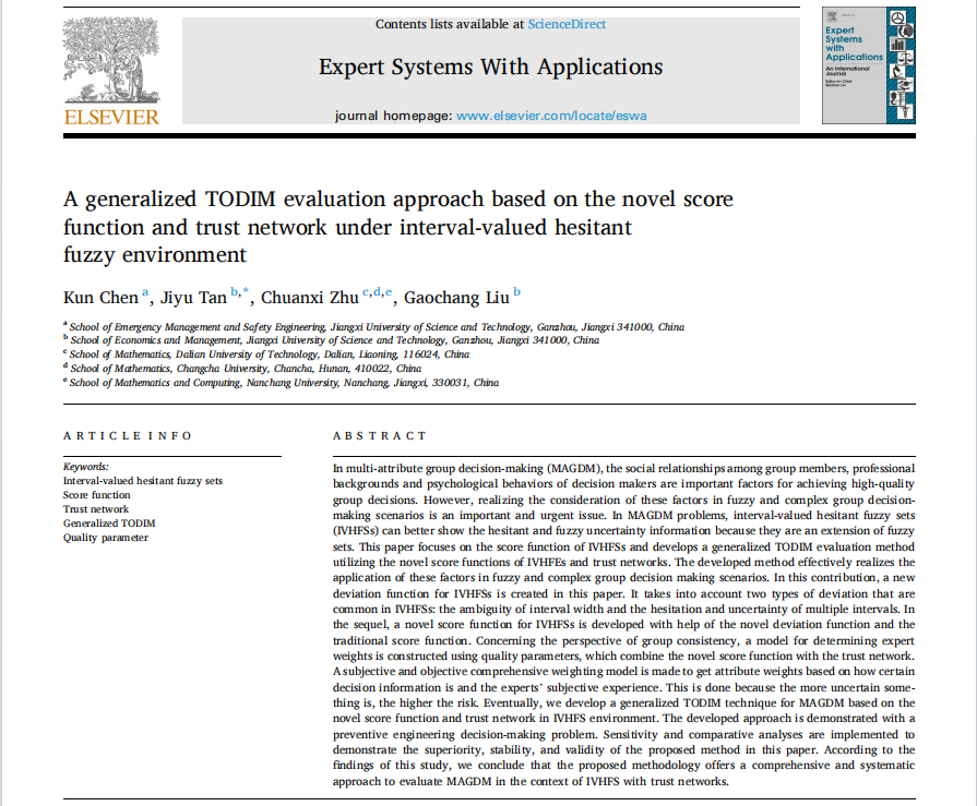 本网讯  近期,应急管理与安全工程学院2022级硕士研究生陈堃在谭吉玉老师的指导下,在计算机科学类TOP期刊《Expert Systems With Applications》上发表论文“A generalized TODIM evaluation approach based on the novel score function and trust network under interval-valued hesitant fuzzy environment”。该期刊为中科院一区TOP期刊,影响因子为7.5,CiteScore为13.8,大类排名11/307。应急管理与安全工程学院为论文的第一完成单位,谭吉玉副教授为本论文通讯作者,2022级硕士生陈堃为第一作者。