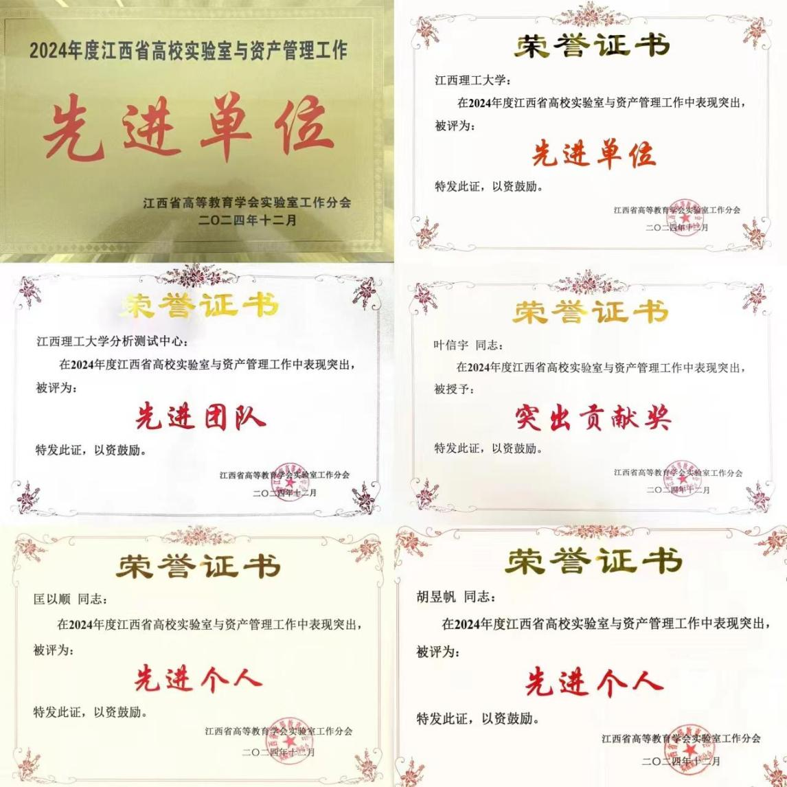 本网讯 12月13日至15日,江西省高等教育学会实验室工作分会2024年学术年会在南昌市举办。年会公布了2024年江西省高校实验室与资产管理工作先进评选结果,颜射 荣获“先进单位”,分析测试中心荣获“先进团队”,机电工程学院匡以顺、能源与机械工程学院胡昱帆2位老师获评“先进个人”称号,分析测试中心主任叶信宇荣获“突出贡献奖”。