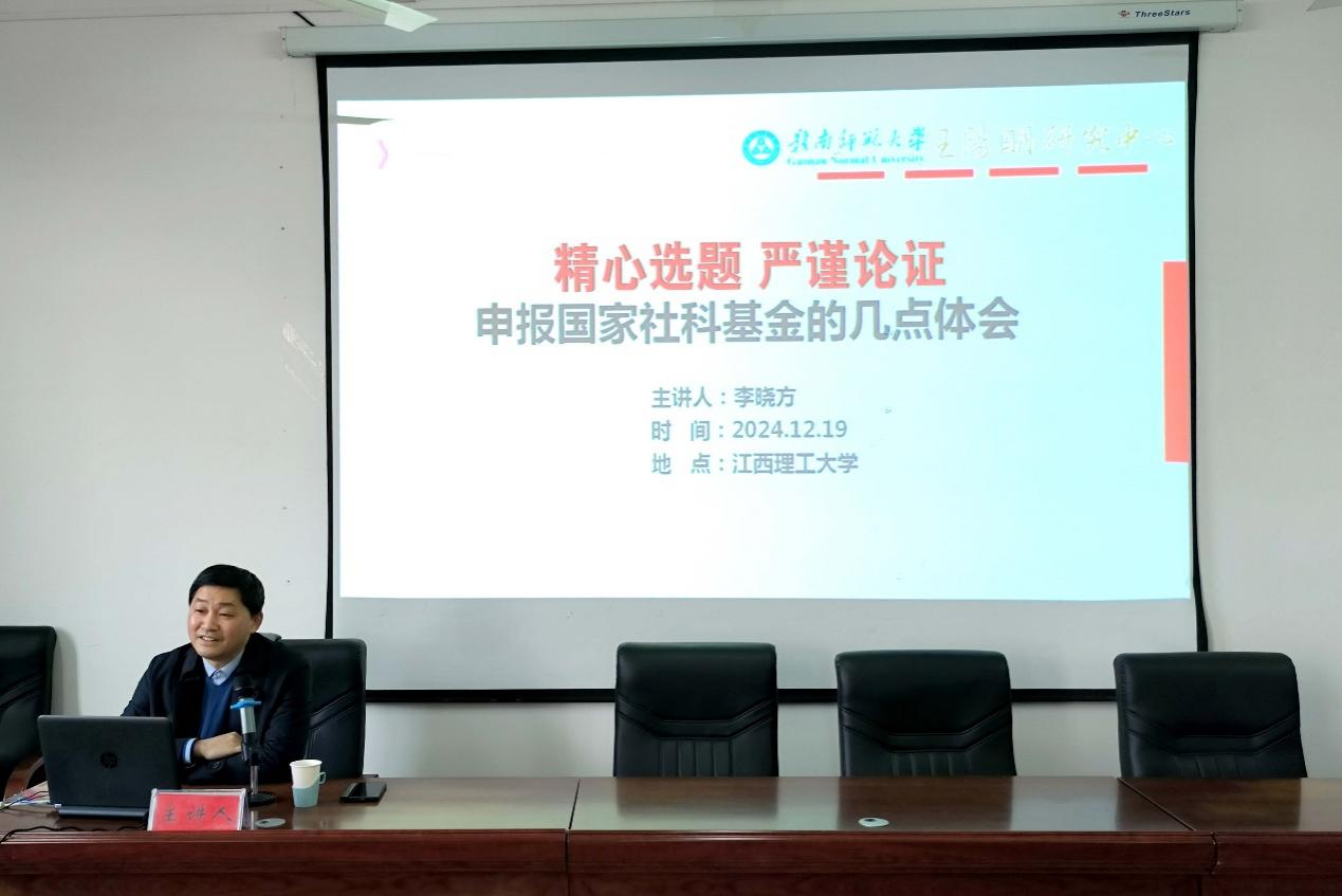 会上,赣南师范大学历史文化与旅游学院院长李晓方教授以“精心选题,严谨论证”为题作专题辅导报告。他从选题、论证和研究基础三个方面分享了国家社科基金项目申报的体会,并为申报2025年国家社科基金项目的教师们提出了三点建议:一是要有明确的研究方向,二是要有必要的前期成果,三是要进行有效的学术交流。