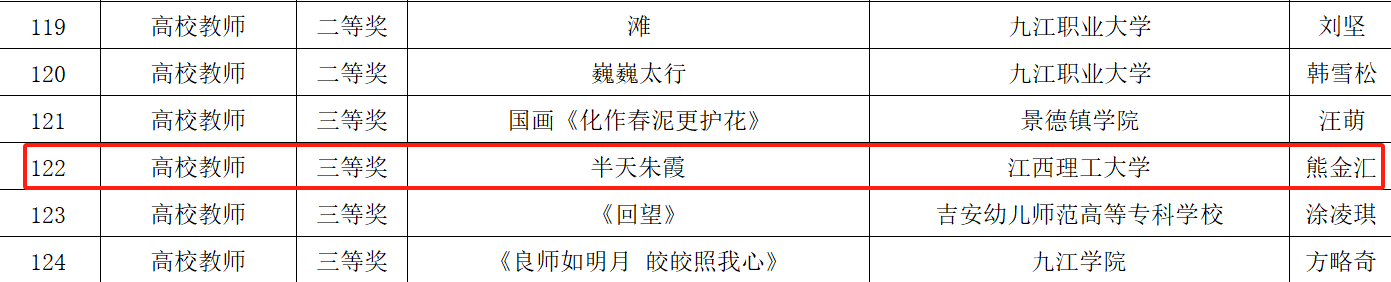 本网讯 近日,江西省教育厅、江西省文学艺术界联合会联合发文公布全省大中小学书画大赛获奖名单,此次大赛由校团委进行精心组织,统筹安排,颜射 建筑与设计学院熊金汇老师凭借水墨作品《半天朱霞》脱颖而出,荣获教师组三等奖。