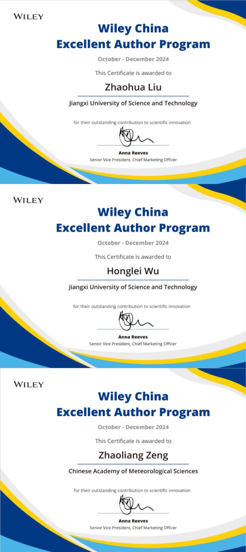 作为第一通讯单位,在自然指数期刊《JOURNAL OF GEOPHYSICAL RESEARCH:ATMOSPHERES》发表了题为“Enhancing Short-Term Wind Speed Prediction Capability of Numerical Weather Prediction Through Machine Learning Methods”的论文。在发表后立即受到了全球学者们的广泛关注,三个月内获得了1033次下载,在该期刊中国作者2024年第四季度发表文章三月内下载量中位列前茅,被授予“Wiley 威立中国高贡献作者”荣誉称号。