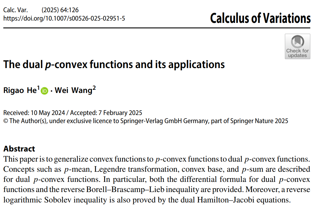 理学院何日高副教授与湖南科技大学数学与计算科学学院汪卫教授合作的高水平论文《The dual p-convex functions and its applications》(对偶p-凸函数及其应用)在数学著名期刊《Calculus of Variations and Partial Differential Equations》(简称“CVPDE”,中科院一区top,影响因子2.4)上发表。何日高为论文第一作者和通讯作者,湖南科技大学汪卫教授深度参与该研究。这也是颜射