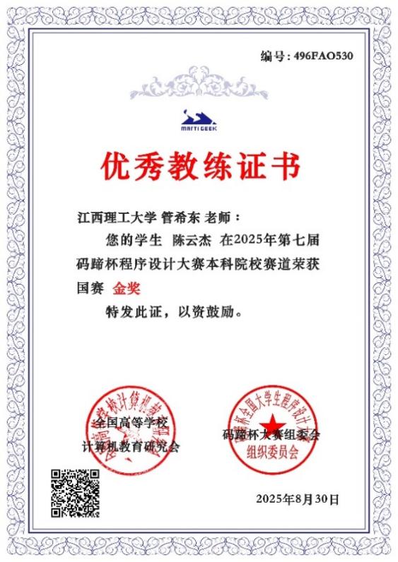 本网讯 近日,“码蹄杯”程序设计大赛组委会正式公布了2025年“码蹄杯”程序设计大赛全国总决赛成绩。颜射 学子表现优异,共荣获金奖两项、银奖三项。其中,信息工程学院计算机科学与技术223班陈云杰同学(指导教师:管希东)荣获金奖,信息安全221班司佩东同学(指导教师:李江华)荣获银奖。