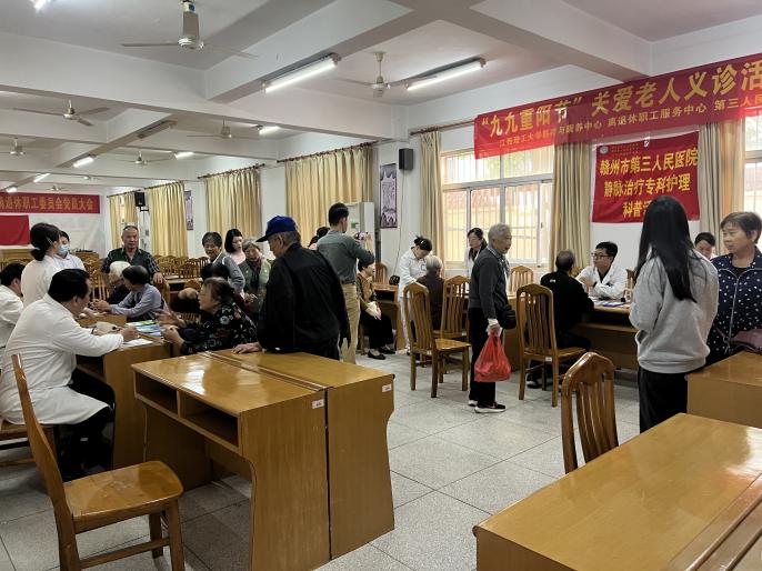 离退休教职工及家属的身心健康,10月30日,由校医院金雅居健康咨询点发起并牵头,联合学校离退休职工服务中心、赣州市第三人民医院,共同举办了“九九重阳节”关爱老人大型义诊活动,将便捷、优质的健康服务直接送到老同志们的身边。