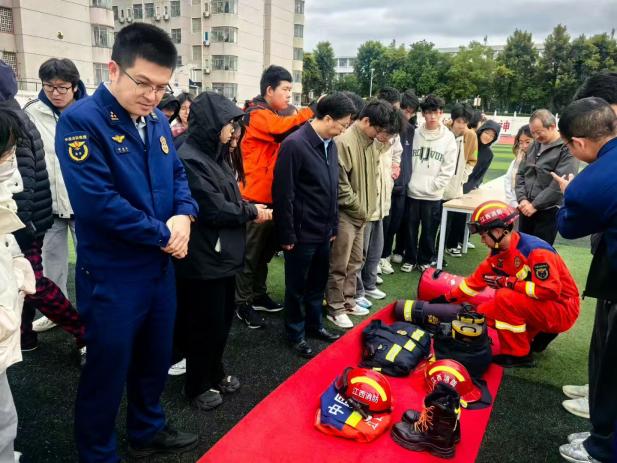 消防器材展示区俨然一座生动的微型“安全科技馆”。消防员们身着消防服,依次向师生演示了灭火器、消防服、水带等关键消防器材的操作方法。他们将实操融入演示中,原本枯燥的安全知识在讲解中“活”了过来,让在场师生直观感受到消防器材在危急时刻的重要作用。