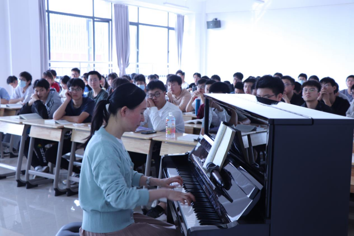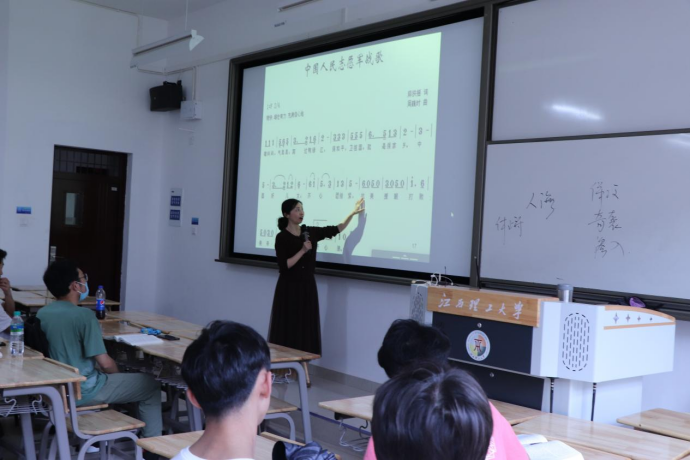 以《中国近现代史纲要》课程为载体,将红色歌曲融入思政课课堂教学,开展了一堂“声”入人心的思政课,点燃了师生们心中火一般的爱党爱国热情。“哎......南湖的船啊,党的摇篮。你和人民心相连,心相连。”在讲授中国共产党的创立时,马克思主义学院钟春明老师带领同学们齐唱《南湖的船,党的摇篮》。同学们聚精会神、兴致盎然,在老师的领唱下,通过歌声表达了对中国共产党的崇高敬意。“歌唱领袖毛主席,歌唱伟大的共产党!”“一送里格红军,介支个下了山”一声声歌声在教室里回荡,瞬间让师生回到了那个战火纷飞的年代,感悟革命先烈舍生取义的伟大革命精神。在优美的旋律、欢快的曲调中,同学们熟知了党的百年历史,感悟了共产党人的精神谱系,汲取了奋进的力量。